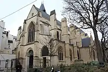 The exterior is a somewhat awkward collection of architecture; the flying buttresses are supported by very massive abutments, but do not align with the chapels alongside the church, indicating that the chapels were built afterwards.[5] The sides of the church are lined by rows of trees, and the building is difficult to see except in winter.