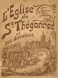 The Église de Saint-Thégonnec, given the classification of a "monument historiques" by the "Commission des Beaux-Arts" in 1886, has undergone many changes since its original construction and now has three naves with seven columns and ten arcades. In the 18th-century, two doorways were created at the base of the bell-tower to allow processions easy access to the church but this change was subsequently reversed at the insistence of the "Commission des Beaux-Arts". Further details of modifications made to the church and other details are given in the excellent book "SAINT-THÉGONNEC-L’église et ses annexes" by the Abbé F. QUINIOU, a vicar of Saint-Thégonnec written in 1909 and published by F.Paillart. The cover of this book is shown on the right.[14]