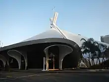 Built by National Artist for Architecture Leandro Locsin in 1968, the design of this parish church in Bel-Air Makati is symbolic of the manner the martyr died crucified on an X-shaped cross. The butterfly shaped floor plan emanates from this cruciform. Many other symbolic features mark the tent-like structure, including the giant chandelier over the altar which serves as a halo over the copper cross by National Artist for Visual Art, Vicente Manansala.[3]