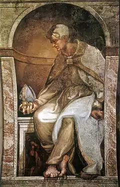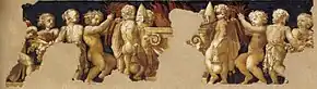 The design included since the beginning a thoroughly painted decoration of the interior, and a contract had been signed with the young Correggio, who a had already worked in another Benedictine monastery, in the Camera della Badessa of San Paolo. Correggio added a painted frieze which runs for the whole internal perimeter.[3] It is long strip with monochrome paintings (with few red details) on a dark blue background, including also some tondoes with portraits of Benedictine popes, cardinals and monks. The main feature is a series of puttos in actions symbolizing the importance of the Christian Mass and sacrifice. The grotesque decorations on the semi-piers and the vault decoration (with candelabra, puttos and symbols of St. John the Evangelist) were also from Correggio's pupils, in particular Michelangelo Anselmi (c. 1520).