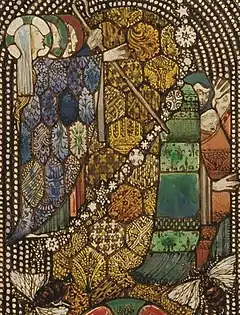 Gobnait is known as the patron saint of bees,[4] and she is shown with bees hovering around her face, with a honeycomb at her feet, along with bees chase the thieves said by legend to have raided her church.[14] In this story she unleashed bees against her attackers; Clarke shows "giant bees and tiny figures of frightened robbers peering out anxiously behind the blue-robed saint, whose pointed, impassive profile, unnaturally long slim hands and geometrically stylised body give her an otherworldly, non-human appearance".[15]