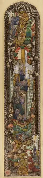 St. Gobnait is shown in profile with a pale, thin and ascetic face and is given individualistic, unmistakable features. She wears royal blue and purple robes adorned with lozenged jewels, a veil and silver cloak.[10][11] The window's borders are lined with beaded decorations in ruby and blue.[4] Her clothing draws from Léon Bakst's costume for Ida Rubinstein's 1911 performance of "Le Martyre de saint Sébastien".[12] Highly detailed and complex floral patterns run along the outer borders of each of the window's registers.[13]