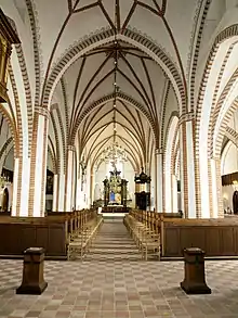 Not much of the original building remains as it was rebuilt in 1636 and subsequently restored on two occasions. Built of red brick with horizontal decorations on the chancel wall, it has large Gothic windows. The date of 1496 on one of the bells in the step-ribbed tower may well be the year the church was completed. The tower is adjacent to Odense Palace which was originally built as a monastery.[1]