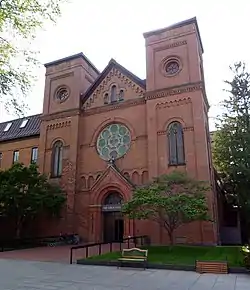 Breuer's design incorporated the traditional axis of baptistery, nave, and altar in a modern concrete structure.[7] The monastic choir stalls and Abbot's throne were placed in a less traditional semi-circular shape around the main altar, which also served to invite the congregation closer.[6] The church was designed so that even with a capacity of over 2000, the entire community was able to feel like they were intimately involved in the liturgy. Perhaps the most striking part of the design was the facade and bell tower, which itself was shaped like a large bell and sat suspended over the main entrance of the church. The "banner" rises 112 vertical feet in front of the church and houses the 5 bells which sound the hours and call the monastic and university communities to prayer.[8][5] The north facade of the building is the largest wall of stained glass in the world and contains 430 colorful hexagons of abstract design.