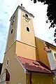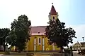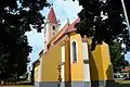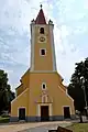 The church was built in the 14th century. It is mentioned in a document at the donation of the village in 1333.[1] It was built in Gothic style. It was vaulted in the 17th century, the roof was also repaired. Only the front side remained in Gothic style. Another reconstruction was done in 1922 along with installing new bells. On November 11, 1922, the reconstructed church was consecrated - since then the winter festival is held. A new organ was installed on December 17, 1925, the tower's roof was covered with sheet metal in 1933. The rectory was built in 1787.
