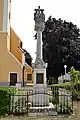 There are some statues in front of the church. The most valuable is the statue of the cross with Jesus Christ and Virgin Mary created by a French sculptor in 1793. In 1908, a statue of Holy Trinity was built from a collection of our countrymen in America. The 3rd memorial is the memorial of killed soldiers in World War I. It was created by a stonemason - sculptor Weinberger from Stupava in 1932.[2]