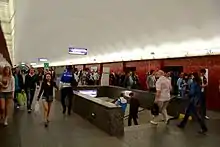 Mayakovskaya station is of the horizontal lift design, a type of platform screen doors unique to the Saint Petersburg Metro.