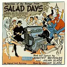 Salad Days premiered in the UK at the Theatre Royal, Bristol in June 1954, and transferred to the Vaudeville Theatre in London on 5 August 1954, running for 2,283 performances[5] to become the longest-running show in musical theatre history until overtaken by My Fair Lady in the U.S. (1956) and Oliver! in the U.K. (1960). In the Evening Standard Awards for 1955, Salad Days was given the Award for Most Enjoyable Show (although The Pajama Game won as Best Musical). The musical was produced by Denis Carey, with dances arranged by Elizabeth West, and with a cast that featured Dorothy Reynolds in a variety of roles, John Warner as Timothy and Eleanor Drew as Jane. Slade played one of the two pianos. The reviewer in The Guardian wrote: "There is no pointed satire, only a passable line of wit, but the effect is one of genuine high spirits and those who liked it on Thursday were ready to call it the gayest piece of entertainment since The Mikado. Others were heard to compare it to a children's party, meaning that they found the fun jejune, 'undergraduate,' and limited."[6] It played to over 1.25 million people and grossed over $1.8 million.[7]