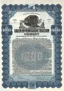 The Salem and Penns Grove Traction Company owned a line from Salem to Penns Grove, New Jersey, connecting the ends of two branches of the Pennsylvania Railroad (later Pennsylvania-Reading Seashore Lines). The company was chartered in 1915, and W. W. Hepburn was the first president.[1][2] Streetcars were discontinued in 1933, and were replaced by buses that had run since 1930, now New Jersey Transit route 468 (Penns Grove-Salem-Woodstown).