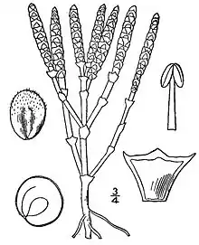 Salicornia bigelovii is a species of flowering plant in the family Amaranthaceae known by the common names dwarf saltwort[2] and dwarf glasswort. It is native to coastal areas of the eastern and southern United States, Belize, and coastal Mexico (both the east and west coasts).[3][4][5] It is a plant of salt marshes, a halophyte which grows in saltwater. It is an annual herb producing an erect, branching stem which is jointed at many internodes. The fleshy, green to red stem can reach about 60 cm in height. The leaves are usually small plates, pairs of which are fused into a band around the stem. The inflorescence is a dense, sticklike spike of flowers. Each flower is made up of a fused pocket of sepals enclosing the stamens and stigmas, with no petals. The fruit is an utricle containing tiny, fuzzy seeds. The southern part of the species range is represented by the Petenes mangroves of the Yucatán, where it is a subdominant plant associate in the mangroves.[6]