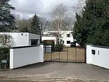 Conduit Head Road is a branched and winding cul-de-sac running north from Madingley Road, in the western outskirts of the town, around 1.5 miles north-west of the centre, and immediately west of the Cambridge Observatory. The entirety of the tree-lined, semi-rural road is designated as a conservation area, which includes multiple listed buildings as well as a wilderness area with ponds, probably resulting from past brick-making; it dates from before 1925.[3] The architectural historians Nikolaus Pevsner and Simon Bradley describe the road as "a progressive enclave" which attracted academics such as the Cornford and Darwin families.[12] The earliest houses in the area were clustered at what is now the north end of the road, and followed a traditional design: Conduit Head (1910), Conduit Rise (originally Grithow Field; 1913 or 1914) and Clement's End (around 1926).[3][13] From the 1930s, a diverse group of Modernist houses were built in an ad hoc fashion;[3] Bradley and Pevsner describe them as forming the "best collection of 1930s Modernist houses" in Cambridge.[14] Salix forms part of a group of three white Modernist houses, which were originally set in extensive grounds and adjacent to the wilderness area.[3][15] Two were built on adjacent plots by George Checkley, White House (1930–31) and Willow House (originally Thurso; 1932–33);[3] Salix (then known as Brandon Hill) was interposed between the two in 1933–34.[2][14] It was extended in 1936.[2]