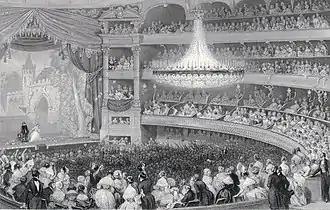 The Théâtre-Italien shared the theater briefly, from 26 June to 4 July 1853, with the Opéra-Comique,[20] and from 16 March 1868 to 5 May 1868 the theater was shared with a new company directed by Léon Carvalho, which was an extension of his Théâtre Lyrique on the Place du Châtelet. The name Théâtre de la Renaissance was revived for the use of Carvalho's venture, in order to distinguish it from the Théâtre-Italien. Carvalho had overextended himself, however, and soon went bankrupt.[9][21] The Théâtre-Italien also shared the theater with the Paris Opéra from 19 January to December 1874 (in the period after the Opéra's Salle Le Peletier burned down on 28 October 1873 and before the opening of the Opéra's new Palais Garnier on 5 January 1875).[22] Companies sharing the theatre usually performed on alternate nights.[23]