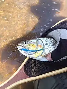 Salminus brasiliensis (dourado, dorado, golden dorado, river tiger or jaw characin) is a large, predatory characiform freshwater fish found in central and east-central South America.[2] Despite having Salminus in its name, the dorado is not related to any species of salmon,[3] nor to the saltwater fish also called dorado. It is very popular among recreational anglers and supports large commercial fisheries.[4]