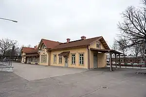 Salo railway station (Finnish: Salon rautatieasema, Swedish: Salo järnvägsstation) is located in the town of Salo in the Southwest Finland region, Finland. All passenger trains between Helsinki and Turku stop at Salo, and the station also serves cargo traffic. About 320 thousand passengers use the station every year. Inside the station, there is one automatic ticket vending machine. The station has three elevated platforms for passenger traffic, and for going underneath the tracks, there is a tunnel, with exits by stairs and elevator.