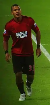 Rondón scored his first goal for the Baggies on 29 August 2015, netting the game's only in stoppage time of the first half of the away fixture against nine-man Stoke City.[37] On 19 December, he was sent off at the end of a 1–2 home loss to AFC Bournemouth for thrusting his head at Dan Gosling, with teammate James McClean also dismissed in the first half;[38] he finished his first season in English football with ten goals.[39]