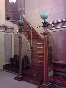 The main entrance is approached by a staircase of three flights respectively consisting of three, five, seven and nine steps. The staircase is flanked by two sphinxes. Each sphinx holds a single sphere, one celestial, one terrestrial, and each is arranged to contemplate its sphere.