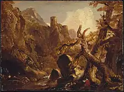 During Rosa's lifetime his work inspired followers such as Giovanni Ghisolfi, but his most lasting influence was on the later development of romantic and sublime landscape traditions within painting.[11] Eighteenth-century artists influenced by Rosa include Alessandro Magnasco, Andrea Locatelli, Giovanni Paolo Panini and Marco Ricci.[11] As Wittkower states, it is in his landscapes, not his grand historical or religious dramas, that Rosa truly expresses his innovative abilities most graphically. Rosa himself dismissed his early landscapes as frivolous capricci in comparison to his history paintings and later work, but the academically conventional history canvases often restrained his rebellious streak. He generally avoided the idyllic and pastoral calm country-sides of Claude Lorrain and Paul Bril in his landscapes, and created brooding, melancholic fantasies, awash in ruins and brigands. By the eighteenth century, the contrasts between Rosa and the "sublime" landscape, and artists such as Claude and the "picturesque" landscape, were much remarked upon. A 1748 poem by James Thompson, "The Castle of Indolence", illustrated this: "Whate'er Lorraine light touched with softening hue/ Or savage Rosa dashed, or learned Poussin drew".[14]