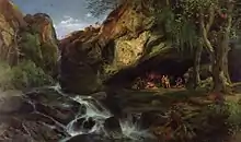 A passage in one of his satires suggests that he sympathized with the 1647 insurrection led by Masaniello—whose portrait he painted, though probably not from life. Rosa's tempestuous art and reputation as a rebel gave rise to a popular legend—recounted in a biography of Rosa published in 1824 by Sydney, Lady Morgan—that Rosa lived with a gang of bandits and participated in the uprising in Naples against Spanish rule.[11] Although these activities cannot be conveniently dovetailed into known dates of his career, in 1846 a famous romantic ballet about this story titled Catarina was produced in London by the choreographer Jules Perrot and composer Cesare Pugni.
