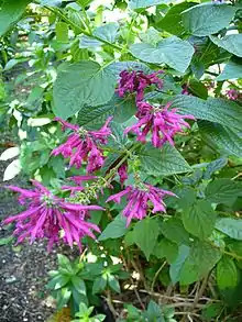 Salvia purpurea reaches up to 7 feet in height, less in width, with ovate yellow-green leaves that have serrated edges. Inflorescences begin appearing in mid-autumn, with the plant blooming into winter. The flowers are a pinkish purple-violet, in tight verticils that look like they are unbalanced on one side of the flower spike. The 0.75 inch flowers are tightly packed at the end of many flowering branches.[1]