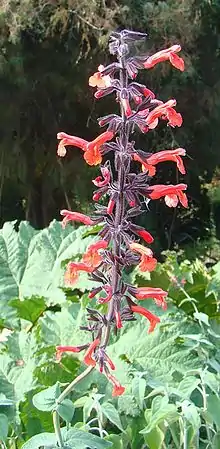 Salvia rubescens is an erect plant that grows 4–5 ft (1.2–1.5 m) tall, and is fully covered with mid-green ovate leaves with a sawtooth edge. The leaves grow as large as 4.5 in (11 cm) long by 3.5 in (8.9 cm) wide, and are lightly covered with hairs on both surfaces. The inflorescences grow another 1–2 ft (0.30–0.61 m) above the foliage, with flowering beginning in midsummer and lasting until the first frost. The flower stems and the calyx are both dark purple and covered with fine hairs. The 1 in (2.5 cm) flowers are a vibrant red-orange color, growing in widely spaced whorls. Many flowers come into bloom at the same time, making for a very showy plant.[1]