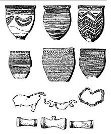 Pottery consists mainly of egg-shaped beakers with pronounced rims. They were not able to stand on a flat surface, suggesting that some method of supporting or carrying must have been in use, perhaps basketry or slings, for which the rims would have been a useful point of support. The carrier slung the pots over the shoulder or onto an animal. Decoration consists of circumferential motifs: lines, bands, zig-zags or wavy lines, incised, stabbed or impressed with a comb. These patterns are best understood when seen from the top. They appear then to be a solar motif, with the mouth of the pot as the sun. Later developments of this theme show that in fact the sun is being represented.
