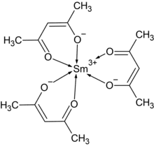 Samarium(III) acetylacetonate is a coordination compound with the chemical formula Sm(C5H7O2)3, or Sm(acac)3 for short. It can react with N-bromosuccinimide in chloroform to give light yellow Sm(Br-acac)3 (where Br-acac is 3-bromo-2,4-pentanedione ligand).[1] Its hydrate can be recrystallized in DMSO to obtain Sm(acac)3·2DMSO·H2O.[2] It reacts with dicobalt octacarbonyl and can be used to prepare SmCo5.[3]