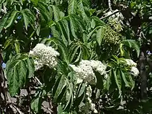 Trees up to 8 m, irregular trunk.[4][5] Leaves compound, with 7-9 ovate-oblong leaflets, margin serrate, acute apex, hairy underside.[4][5] The inflorescences are cymes 18–22 cm long, with white fragrant flowers.[4][5] The fruits are black berries 1.2 cm in diameter, with 3-5 seeds.[4][5]