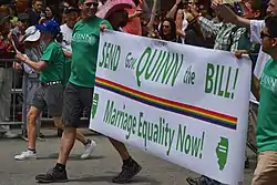 In 1996, because Hawaii seemed poised to legalize same-sex marriage,[5] the Illinois Marriage and Dissolution of Marriage Act was amended to prohibit marriage between two individuals of the same sex,[6] and state that "marriage between 2 individuals of the same sex is contrary to the public policy of this State".[7] This was repealed in 2014. Attempts to add language banning same-sex marriage to the State Constitution have not been successful.[8][9][10]