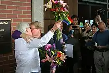 Minutes after the decision was announced at noon, officials in at least four counties were fulfilling requests for marriage licenses from same-sex couples. The first to wed in Multnomah County were two of the plaintiffs, Deanna Geiger and Janine Nelson.[41] That county issued 96 licenses the first day, and judges officiated at wedding ceremonies in a Portland ballroom.[42][43][44] Governor John Kitzhaber, the named defendant, said "I strongly support Judge McShane's decision to overturn institutional discrimination in Oregon's constitution. No longer will Oregonians tolerate discrimination against the gay, lesbian, and transgender community. [...] Now, finally, all Oregonians will have the opportunity to make a legal commitment to the person they love. Every person and every family in Oregon deserves that chance. Today is a win for love, for families, and for freedom." Senator Jeff Merkley called it "a historic day for Oregon", and Senator Ron Wyden said, "Judge Michael McShane's decision marks a significant moment in Oregon's civil rights history, and it's an important step toward equal rights for all Americans. Every American deserves the freedom to marry the person they love, and, starting today, all Oregonians will have that choice. I am proud to have stood with Oregon's same-sex couples in this struggle for marriage equality for nearly 20 years, and it's important to keep pushing until that right extends to all Americans." The Republican House leader, Mike McLane, issued a statement, "For those that believe marriage is a religious covenant, the origin of which predates America, today's federal court ruling won't change that. For those that believe marriage is a legal union between two people that is recognized and enforced by our state government, today's ruling is a logical extension of the Supreme Court's ruling last summer. Our society must embrace both views. My hope is that the process of reconciliation in Oregon will continue as we move forward with respect for each other." Val Hoyle, the Majority Leader of the House, said "I married the person who I love over 22 years ago, and I'm thrilled that all Oregonians now have the freedom to do the same."[45]