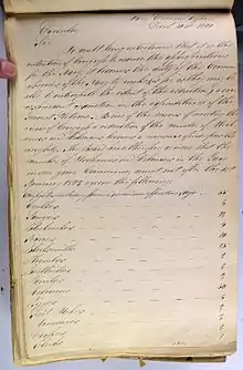 One significant achievement for navy yard during the Evans years was the construction and launch in May 1820 of the 74 gun ship of the line USS Ohio, the first ship built at Brooklyn Navy Yard.[9] Samuel Evans tenure at the navy yard though was beset by problems. One of the most difficult challenges was economic, the Panic of 1819. In response to this economic downturn President James Monroe and to ensure financial stability made large cuts to the annual naval appropriation and as a consequence Evans was ordered to reduce the wages of all navy yard mechanics and laborers across the board. These wage reductions were dramatic and highly unpopular. For example, on 24 May 1820 the Board of Navy Commissioners directed Evans that ship carpenters wages were to be reduced from $1.62.5 per day to $1.25 per day and laborers wages reduced from 90 cents per day to 75 cents per day 24 May 1820 [10] This order was followed by yet further reductions in both wages and hours of work. Evans, in distress, on 10 December 1821 wrote to the Board "all the Carpenters employed excepting five, and all the Blacksmiths excepting two, have left off work this morning."[11] Similarly in December 1821 the size of the navy yard workforce was restricted to just 151 employees.[12]