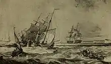 In 1808 he joined the "Associated Artists in Water-Colours",[2] and sent eleven drawings of shipping and marine subjects to the first exhibition of that short-lived body. He also exhibited twelve works in 1809, and six in 1810, but after that date resigned his membership. His works were carefully drawn and freshly coloured, with great attention to the details of shipping. "Among them are the series of 84 drawings which were engraved by William Bernard Cooke for his work 'The Thames'",[3] published in 1811, and eleven others made for the "Picturesque Tour of the River Thames", published by William Westall, R.A., and himself in 1838.[1]