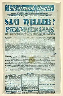 At least four productions of Pickwick were being performed on the London stage while the novel was still being serialised, with Moncrieff's adaptation described as the most successful.[8] As the title suggests, Moncrieff decided to focus on Sam Weller, the main comic character in the novel, rather than on Samuel Pickwick himself.[9][10][11]
