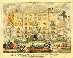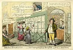 Samuel William Fores, often credited as S. W. Fores (1761 – 3 February 1838) was an English illustrator and publisher/printer based in Piccadilly, London.[1] Fores, the son of a cloth merchant, began his career publishing his illustrations in 1783. He operated from premises at No 3 Piccadilly from 1785 and moved to 50 Piccadilly from 1795.[2] He specialised in caricature, typically hand-coloured, singly issued prints.[3][4] He became successful at marketing his works, which he often sold wholesale.[4] Fores acquired a particularly large collection of caricatures, and at one time was said to have "the completest collection in the kingdom" in his Caricature Museum.[5] He died in February 1838 at the age of 77 and was buried in his family vault at St. James Church in Jermyn Street.[6]