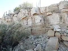 The formation is transitional with the underlying Glorieta Sandstone or Yeso Group. Where the basal sandstone beds are a minor component compared with marine limestone, these beds are assigned to the Rio Bonito Member of the San Andres Formation and no Glorieta Sandstone is mapped. Where the basal sandstones contain little or no marine limestone, the lower beds are mapped as Glorieta Sandstone and no Rio Bonito Member is mapped. This transition from clastic to marine beds represents a late Leonardian marine transgression that was the last to reach northern New Mexico for the next 150 million years.[4] The remaining members are the Bonney Canyon Member, a relatively thin section of thin-bedded limestone with local gypsum beds, and the upper Fourmile Draw Member, which is primarily marine carbonates. The Fourmile Draw grades into the Brushy Canyon and Cherry Canyon Formations in the Delaware Basin and contains considerable gypsum in the Guadalupe Mountains. The entire San Andres Formation tends to become more dolomitic to the north.[4]