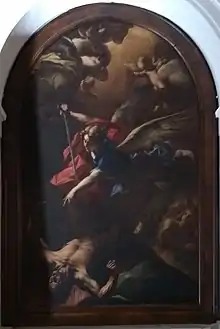 Above the front altar on the right side wall is a crucifixion scene by Giovanni Battista Benaschi from the 17th century,[6] above the rear altar on the right is the depiction of Saints Paschalis, Diego and Salvatore d'Orta, a work by Giacinto Calandrucci. On the centre wall are the relics of Blessed John Baptist of Burgundy.