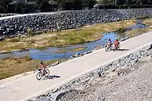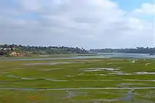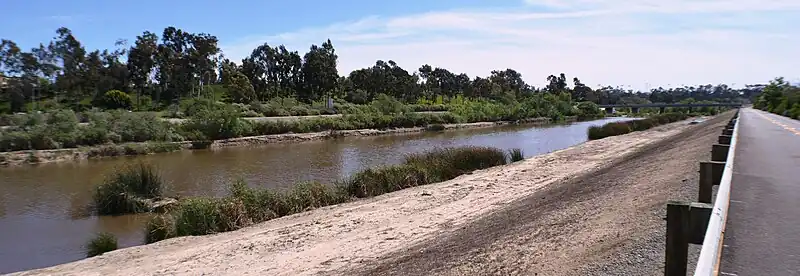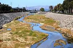 San Diego Creek is a 16-mile (26 km) urban waterway flowing into Upper Newport Bay in Orange County, California in the United States.[1] Its watershed covers 112.2 square miles (291 km2) in parts of eight cities, including Irvine, Tustin, and Costa Mesa.[2] From its headwaters in Laguna Woods the creek flows northwest to its confluence with Peters Canyon Wash, where it turns abruptly southwest towards the bay. Most of the creek has been converted to a concrete flood control channel, but it also provides important aquatic and riparian habitat along its course and its tidal estuary.[3]