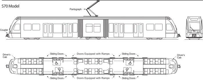 The MTS and SANDAG agreed to purchase a total of 65 vehicles, which would arrive between September 2011 and January 27, 2015.[13][15] However, there was not enough funding to replace all 123 high-floor cars at once. The decision was made to retire the original Siemens-Duewag U2 LRVs, and operate three-car trains with the new low-floor LRVs in the front and back, and an older high-floor Siemens SD-100 car in the middle.
