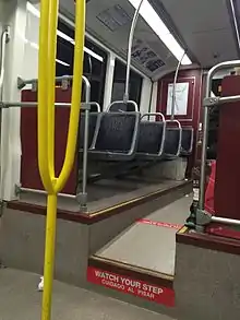 To enable the switch to a low-floor light rail vehicle (LRV) fleet, platforms at 35 stations would need to be raised from either ground level or sidewalk level (4-inch (102 mm)) to 6-inch (152 mm). Stations also needed a new "safety edge tile" with a smooth surface in the center to allow wheelchair ramps to deploy (the existing safety tile would stop ramps from fully deploying). The other complication of the switch to low-floor LRVs was that the traditional Siemens S70, like those ordered for the Green Line, were over 90 feet (27 m) long, so a three-car train would not fit within Downtown San Diego's 240 feet (73 m) blocks.[13] The MTS teamed up with the Utah Transit Authority, which faced a similar problem with its system. The solution for both agencies was a specialized design Siemens called the S70 US ("Ultra Short") which retains the low-floor design, but would be the same length as the older high-floor vehicles (80 feet (24 m)).[14]