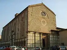 Construction of the church and adjacent monastery was begun in 1282, and continued till 1325. The bell-tower was added in 1313. Only the first story of the church facade was faced with green and white marble and stone, while the superior portions remain in unadorned brick. The external arches are attributed to Giovanni Pisano. The portal of the church has heraldic symbols recalling the patronage of Cardinal Niccolò Albertini, in its construction.