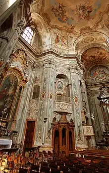 The church, dedicated to St Phillip Neri, was designed by the brothers Pietro Giacomo, Michele, and Domenico Sartorio[1] and built during 1740-1745. The Sartori also completed some of the statuary. The interior is extravagantly decorated, with frescoed surfaces and polychrome altars. The nave ceiling and walls were frescoed (1756) by Carlo Innocenzo Carloni and his studio. The scenes depict the Glory of St Phillip, a Holy Trinity, and the Crucifixion at the apse.[2] The cupola is frescoed with the Assumption of the Virgin and the spandrels with the Evangelists. The wooden choir above the entrance was painted by Federico Ferrari. The organ (1779) was built by the Serassi brothers of Bergamo. Other works are by Giorgio Federico Fochezer and Giovanni Battista Trotti.[3]
