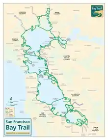 The San Francisco Bay Trail is a bicycle and pedestrian trail that when finished will allow continuous travel around the shoreline of San Francisco Bay. As of 2020, 356 miles (573 km) of the trail have been completed. When finished, the trail will be over 500 miles (800 km) of paved and gravel paths, bike lanes, and sidewalks, linking 47 cities across nine counties and crossing seven toll bridges. It is a project of the Association of Bay Area Governments (ABAG) and the Metropolitan Transportation Commission (MTC), in collaboration with other agencies, private companies, non-profit organizations, and advocacy groups.