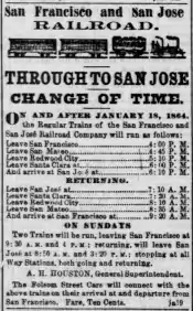 - 1 2 "San Francisco And San Jose Railroad; Two Trains Daily, Each Way". California Farmer and Journal of Useful Sciences. 19 February 1864. Retrieved 19 April 2017.