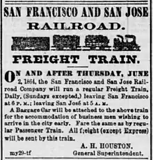 - ↑ "THE SAN JOSE RAILROAD". cdnc.ucr.edu. Marysville Daily Appeal, Volume V, Number 139, 11 June 1862. Retrieved 2 August 2022.