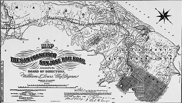 The San Francisco and San Jose Railroad (SF&SJ) was a railroad which linked the communities of San Francisco and San Jose, California, running the length of the San Francisco Peninsula. The company incorporated in 1860 and was one of the first railroads to employ Chinese laborers in its construction.[1] It opened the first portion of its route in 1863, completing the entire 49.5-mile (80 km) route in 1864. The company was consolidated with the Southern Pacific Railroad in 1870. Today, Caltrain and the Union Pacific Railroad continue to operate trains over part of the company's original route.