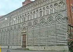 The appearance of the edifice is mostly defined by its northern side, originally parallel to now disappeared walls. The southern side faces the cloister, while the apse side and the façade are barely visible due to nearby structures. The northern flank has most of the external decorations, including a rich portal with a sculpted architrave depicting the Last Supper, signed and dated (1166) by the master Gruamonte. this sculptor also completed a portal in the church of Sant'Andrea. The pattern of the wall is typical of other buildings in Pistoia, and inspired by the contemporary Pisan Romanesque: it features rows of small arcades on small or blind columns with small windows and lozenges inscribed within the arches. The stones used, white and green in color, are respectively marble and serpentine from Prato.[3]