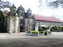 Its façade can compare immeasurably with existing Spanish-style church edifices and architectural design. The church is located in a place that used to be called Cabagsac, referring to the proliferation of fruit bats. In fact, today, a fishnet is permanently installed high above the altar precisely to catch thousands of bats that are roosting inside the church. The interior is dark, has an ambience of antiquity and mystery and overpowering odor of bat urine. The main attraction is the three-tower facade, perhaps one of its kind in the country. Not to be missed is the ancient cemetery located in a hidden corner at the back of the church, with some tombstones dating back to the 1800s and bearing the names of the town's prominent families, including the Elizaldes, Ablazos, Francos, Tarucs, among others.[17]