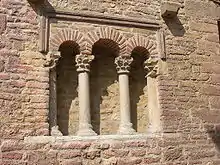 In the rectangular sanctuary atriplet round-arched window (2 by 2 metres (6.6 ft × 6.6 ft) is preserved. With its pre-romanesque bases, rough brick arches, and capitals with rude packed leaves, it gives an idea of the better style of building and carving in the time of Alfonso II of Asturias. It is known that the church of San Tirso housed Royal Chapel.[2]