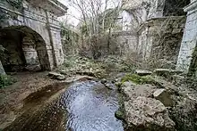 San Vittorino is a Baroque former Roman Catholic church in Cittaducale, province of Rieti, region of Lazio, Italy. Soon after completion in 1613, the church collapsed into a sinkhole, and the roofless ruins remain, with the facade sheltering a mineral-water pool that streams out the former portal. The combination of ruins and nature create an air of mystery; the church was used in some of the scenes of the movie Nostalghia.[1]