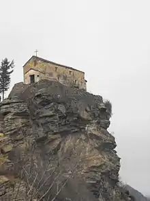 The Sanctuary of Santa Cristina is a stone chapel or small church perched precariously atop a rocky crag, some 1300 meters high, overlooking the Val Grande National Park. It is within the territory of the comune of Cantoira in the Metropolitan City of Turin, Piedmont, northern Italy. The church is only accessible via an arduous trek up hundreds of hewn stairs. A procession on foot takes place every July 24 from the town to the shrine.