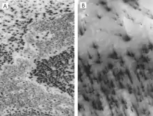 NASA has proposed that the existence of sand geysers on the surface of Mars explains some of the seasonal variations of light and dark areas. Plume-like markings that begin to appear during the martian spring may be caused by solid CO2 transforming explosively into its gaseous state causing an eruption of soil materials.[6]